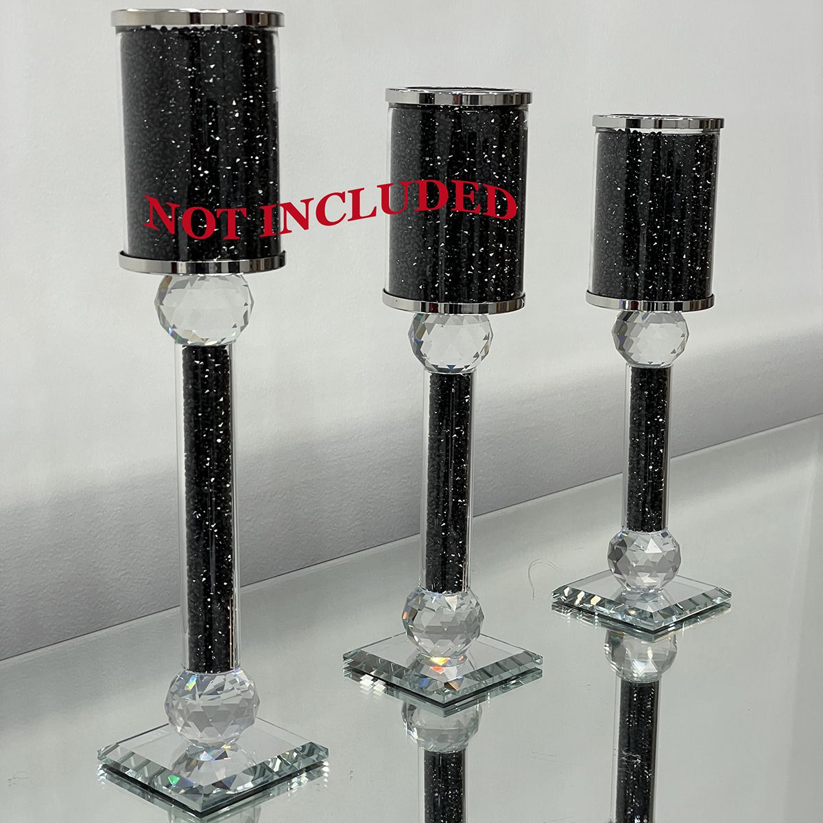 Bring an elegant touch to any tabletop with this beautiful, crystal embellished, decorative candlestick holder. Made of crushed diamond glass, this luxury accent is suitable for any home, office, or occasion. The candlestick holder measures 2.75" L X 2.75" W X 10.25" H. Candles not included. Cleaning Instructions: Wipe with damp cloth or non-abrasive cleaner. 90 Day Limited Manufacturer Warranty.