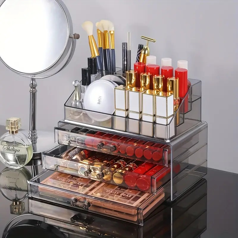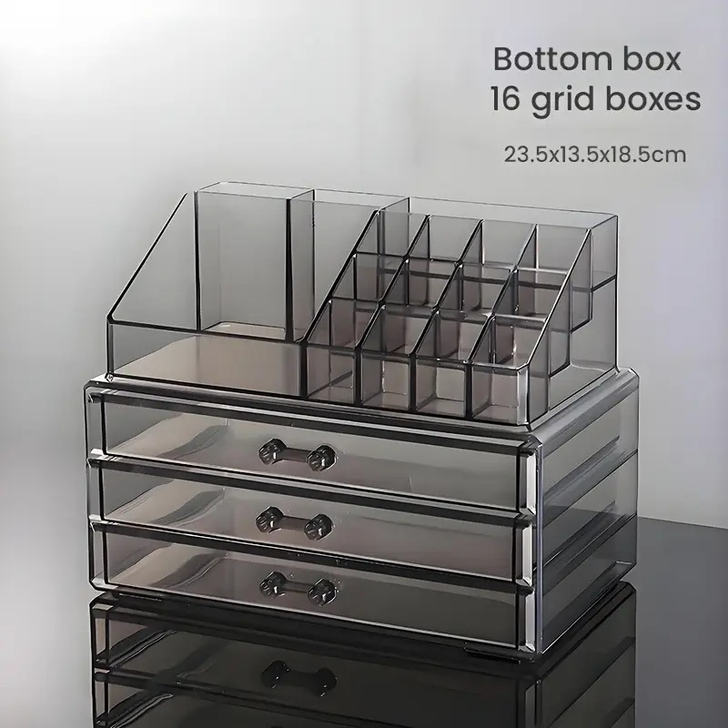 Premium Features:✨ 16-Compartment Top Tray + Bottom Drawer – Ample space for organizing jewelry, makeup, nail art supplies, stationery, and more✨ Crystal-Clear Transparent Design – Quickly locate items at a glance with high-visibility acrylic construction✨ Smooth Polished Finish – Scratch-resistant surface maintains elegance on vanities or desks✨ Smart "Easy Shake" Feature – Gently shake to level contents in compartments (ideal for beads/glitter)✨ Freestanding Compact Design – Fits perfectly on bathroom counters, dressing tables, or office desks Dimensions & Specifications:✔ Overall Size: [L] x [W] x [H] inches (provide exact measurements)✔ Compartment Sizes: Multiple configurations for different item types✔ Material: Durable, BPA-free thick plastic✔ Weight Capacity: Supports [X] lbs when fully loaded