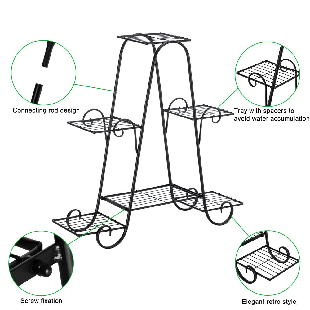 1. Garden iron flower pots holder shelf can holds 7 planters, it decorates your house, garden, balconies, hallway, patios, decks, except a plant stand, it also can be used as book shelf, storage shelf.