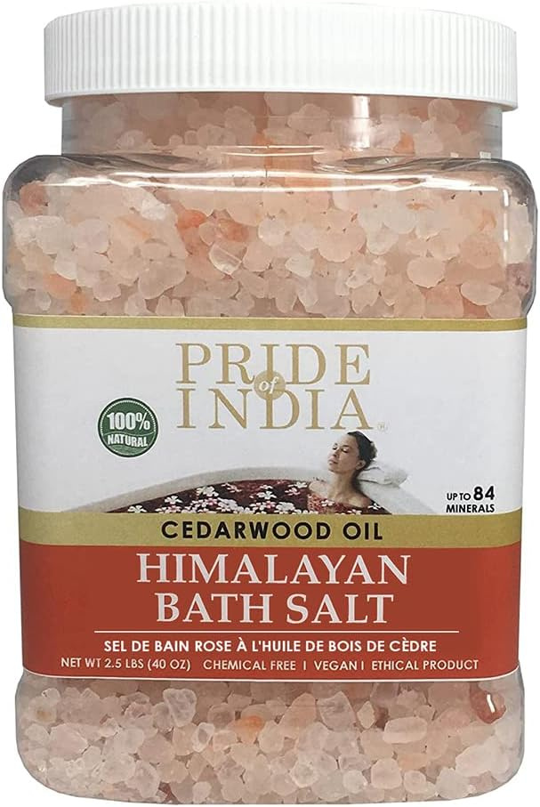 2.BATH SALT WITH CEDARWOOD OIL: This large himalayan bath salt contains up to 85 other minerals to help you get the most benefits out of your bath. Cedarwood oil helps improve focus and reduce skin irritation. Rock salts have traditionally been used in baths to promote healing, relieve sore muscles, and reduce stress. The ingredients in this bath salt are 100% natural.