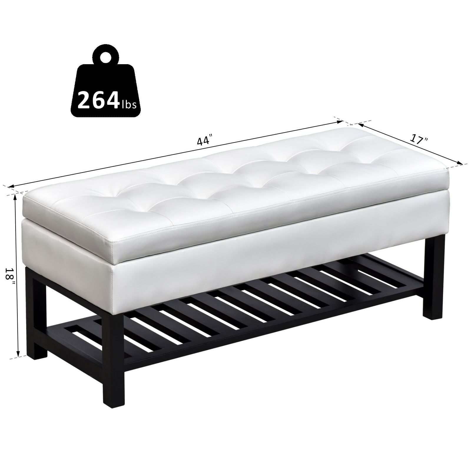 Finding the right style is necessary to help bring a room together. This chic, stylish HomCom faux leather storage bench, shoe rack combo is the perfect addition to any living room, or entryway. It features a beautiful elegant faux leather exterior and tufted top, along with sturdy wooden legs, spacious shoe rack, and a roomy interior that is perfect for storing extra pillows and blankets, shoes, or other accessories. The thickly padded, foam cushion top provides you with complete comfort and support when used as additional seating and the whole bench is supported by a hardwood frame and legs that can support up to 265 lbs. Whether you are using this bench as extra seating, a storage unit, or just to put your feet up, this HomCom Ottoman will enhance any space it is placed in.