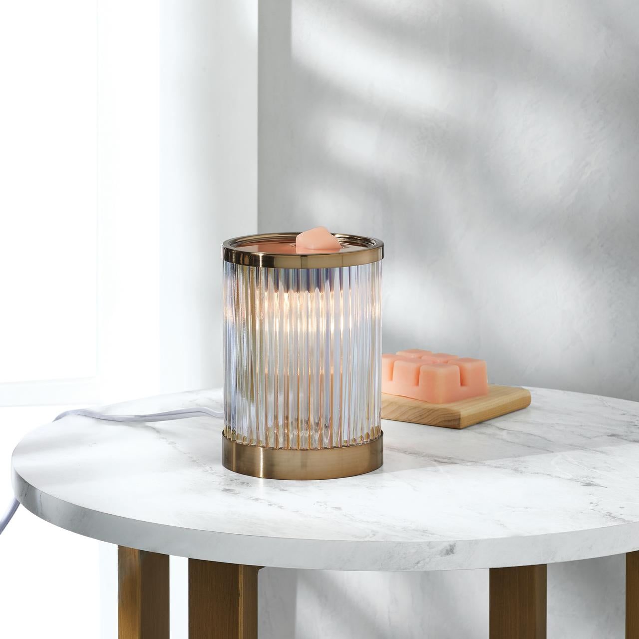 The Ribbed Glass Fragrance Warmer brings style and functionality to your home. The Ribbed Glass warmer is made of a decorative ribbed glass with brushed antique gold on top and bottom. It gently melts scented wax, releasing aromatic scents that fill an entire room with inviting warmth. It produces a soft glow from inside when plugged in. The soft 25W light provides a relaxing, decorative atmosphere and melts your choice of fragrance wax cubes. The fragrance wax warmer creates a relaxing atmosphere while giving you a safe heat source to melt your choice of fragrance wax melts (sold separately). The use of an electric light makes this a safe way to heat your fragrance with no soot or residue. This Ribbed Glass Fragrance Warmer is perfect for adding the right amount of ambience and fragrance to your space.