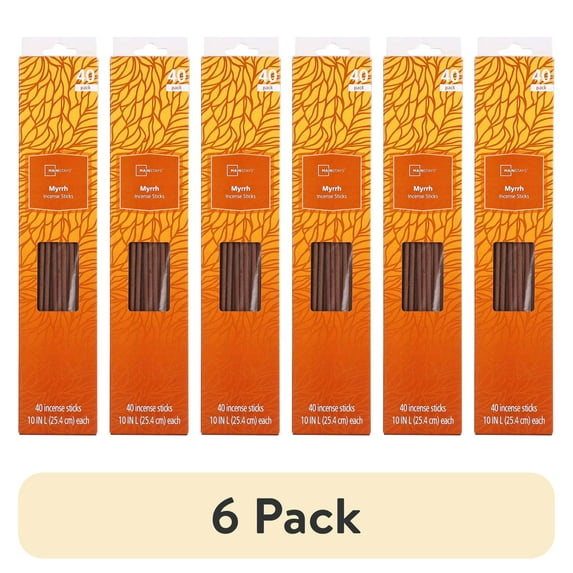 Enjoy the deep, aromatic scent of Mainstays Myrrh Fragrance Incense Sticks with this convenient 6-pack bundle. Each box contains 40 incense sticks in a soothing orange color, totaling 240 sticks that bring warmth and calm to any space.