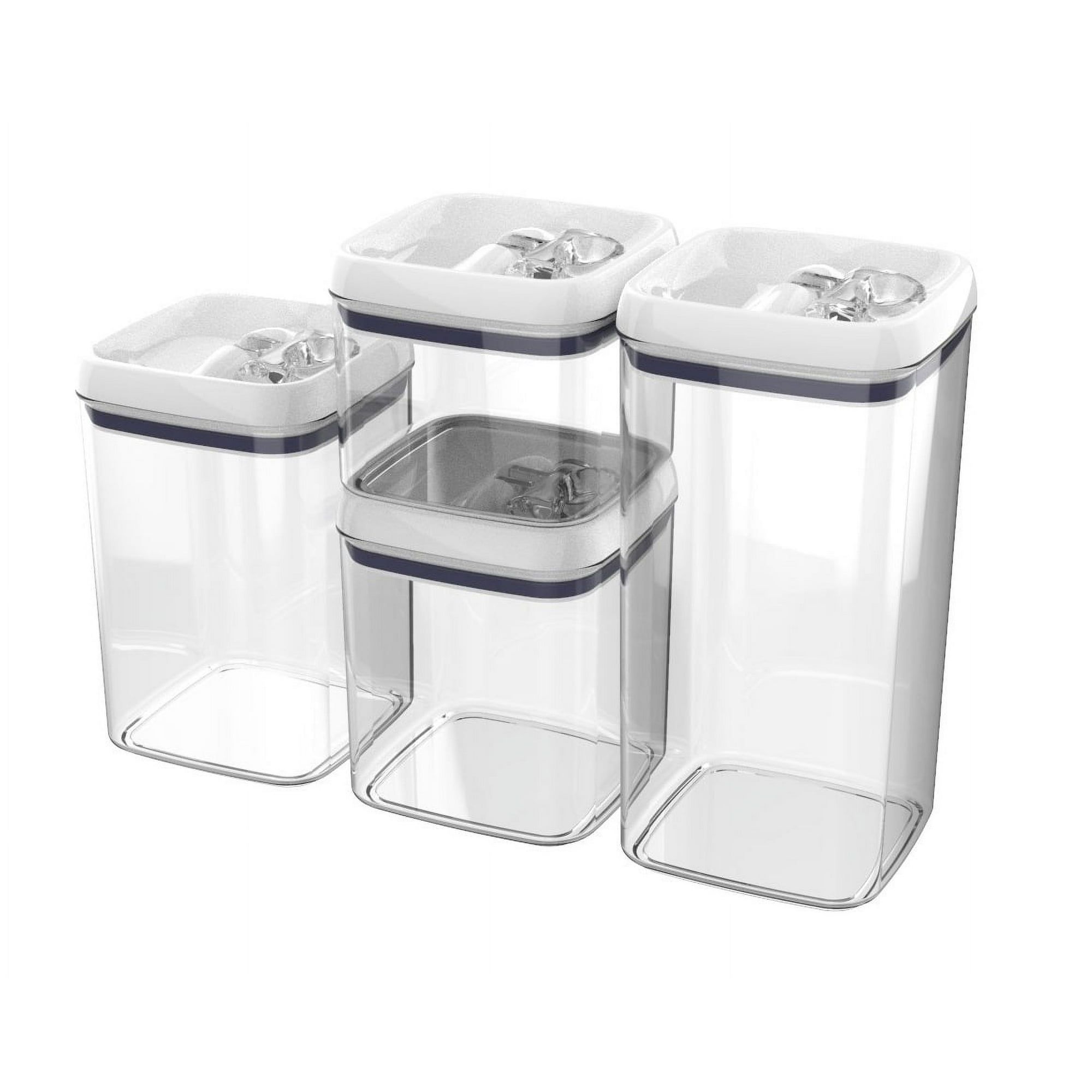 Keep your kitchen countertops organized with Flip-Tite® Food Storage Containers. It is a handy item to have in your kitchen or pantry. These food storage containers are great for storing dry foods, such as flour, dried beans, pasta, and more. They're made without Bisphenol-A (BPA) to ensure the safety of your food. The see-through container makes it easy to identify the contents at a glance without having to label each canister. Open them with ease and stack one or more on top of the other for space-saving storage. This 4 pack set includes 1 of 6.2-cup small square food storage container, 1 of 10.1-cup medium square food storage container, 1 of 13.8-cup large square food storage container, 1 of 19-cup square tall food storage container and 4 lids. Always wash before first use and remove seal from lid before wash. Allow all components to dry thoroughly before next use. Container and lid are dishwasher safe, the silicone seal is hand wash. Not Microwave safe. Do not carry Flip-Tite® Container by the lid.