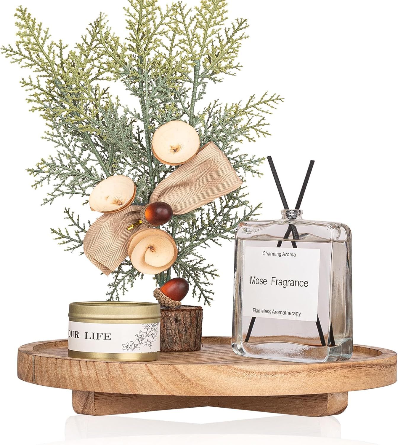 4.Modern Farmhouse Style: The distressed finish gives it an artistic feel, and its rustic style adds a highlight to your home. You can place your favorite column candles to create a unique candlestick tray, or add some spherical decorations to brighten up your coffee table.