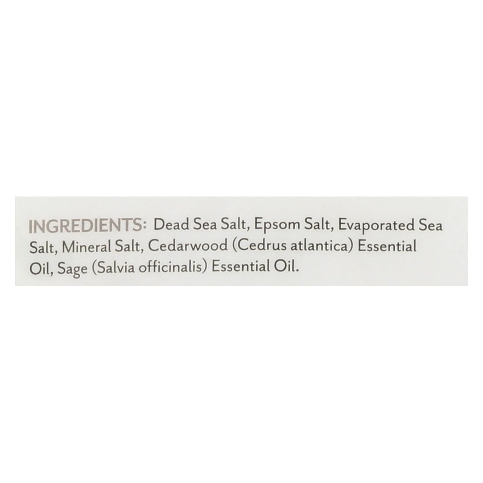 ingredients : dead sea salt;epsom salt;evaporated sea salt;mineral salt;cedarwood;cedrus atlantica;essential oil;sage;saliva officinalis